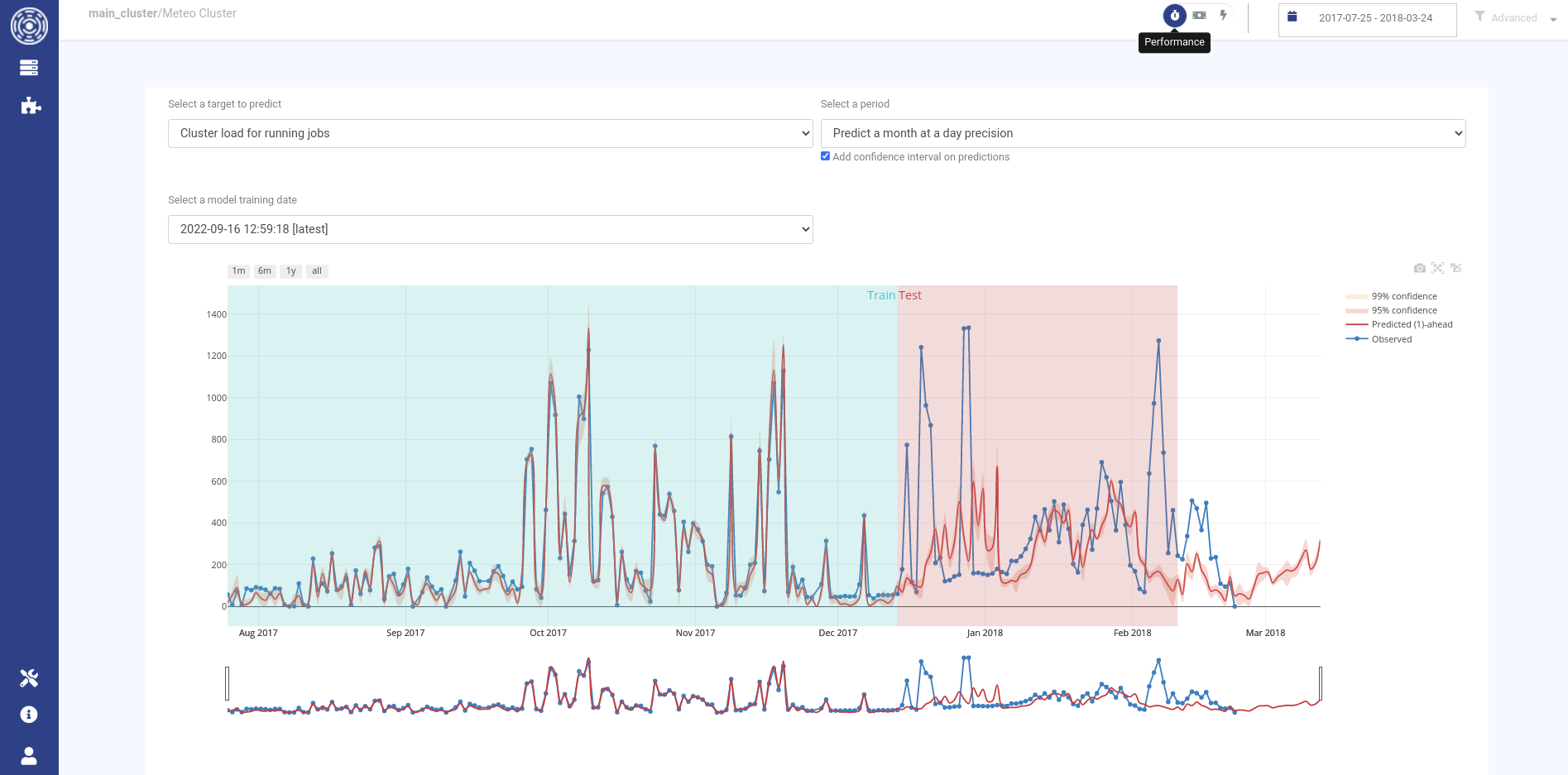 Use the date filter to select the period during which you would like to retrieve the observed values. You can add the confidence intervals on the predictions using the checkbox (available only for LSTM algorithm). You can choose to display the predictions for an older model by choosing another training date in the corresponding dropdown list.