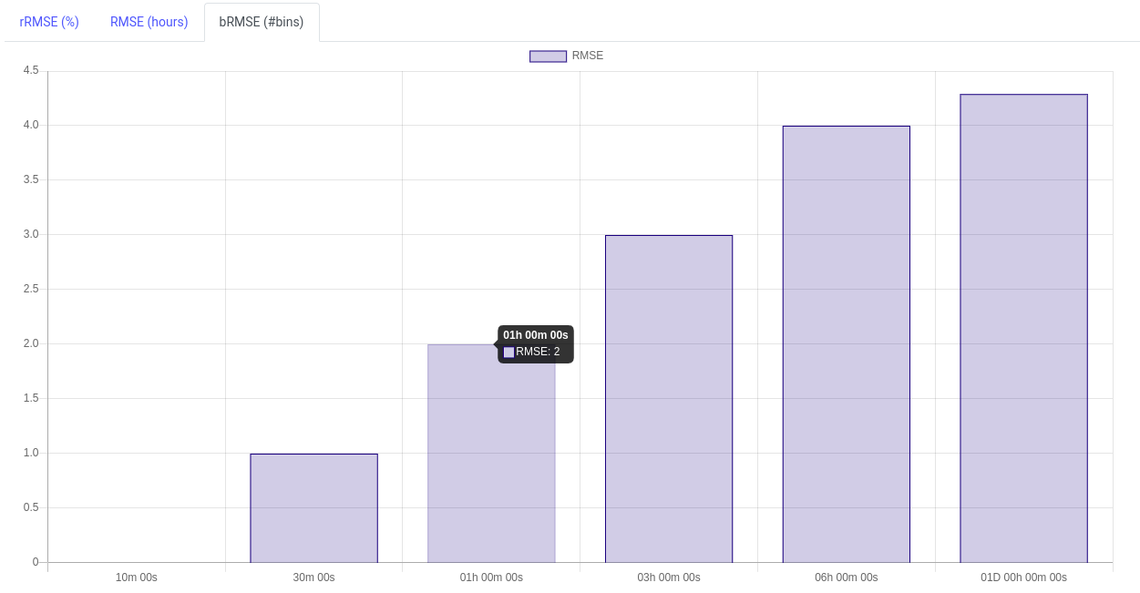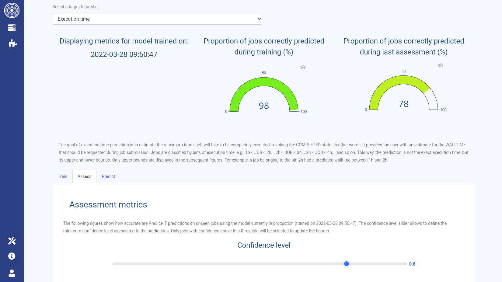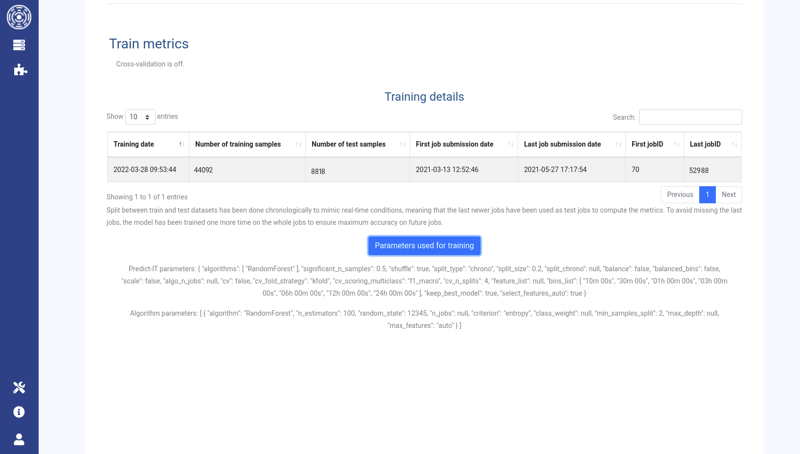 The user can choose to display the metrics for an older model by choosing another training date in the corresponding dropdown list.