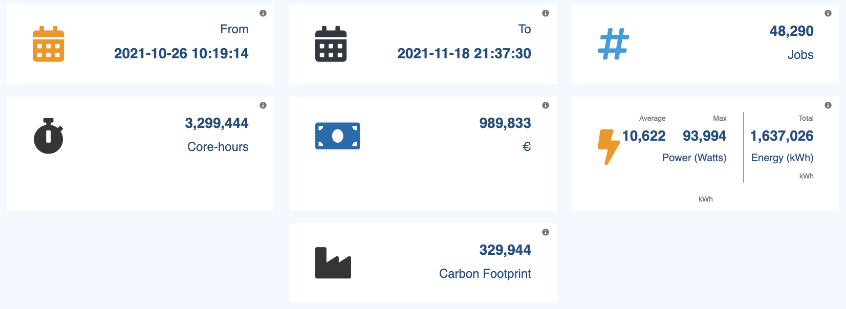 Average and maximum power consumed by the jobs. Power for jobs running at the same time are summed to compute the power for the whole workload.