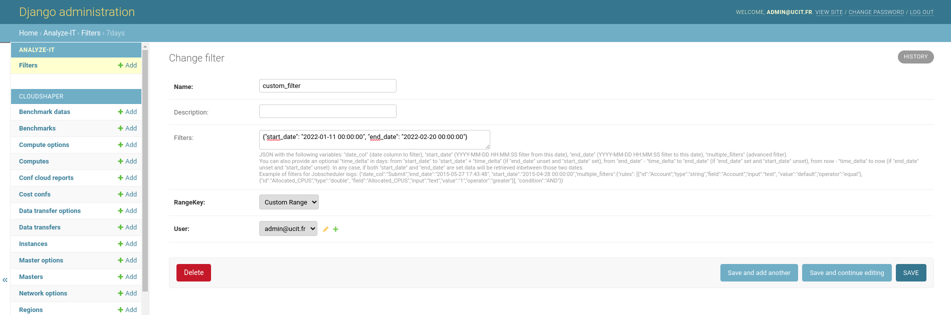 multiple_filters: Filter on features (jobs features…). For example:"multiple_filters":{"rules": [{"id":"Account","type":"string","field":"Account","input":"text", "value":"default","operator":"equal"}, {"id":"Allocated_CPUS","type":"double", "field":"Allocated_CPUS","input":"text","value":"1","operator":"greater"}], "condition":"AND"}}