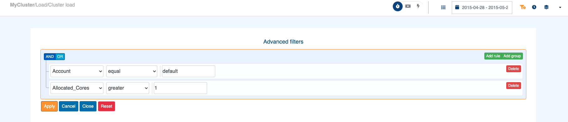 The advanced filter allows to create groups of rules to filter the data displayed in the current module. All fields saved in the database are available in the advanced filter. For example, in the State module, you will be able to filter the jobs with a specific account and more than 1 allocated CPU.