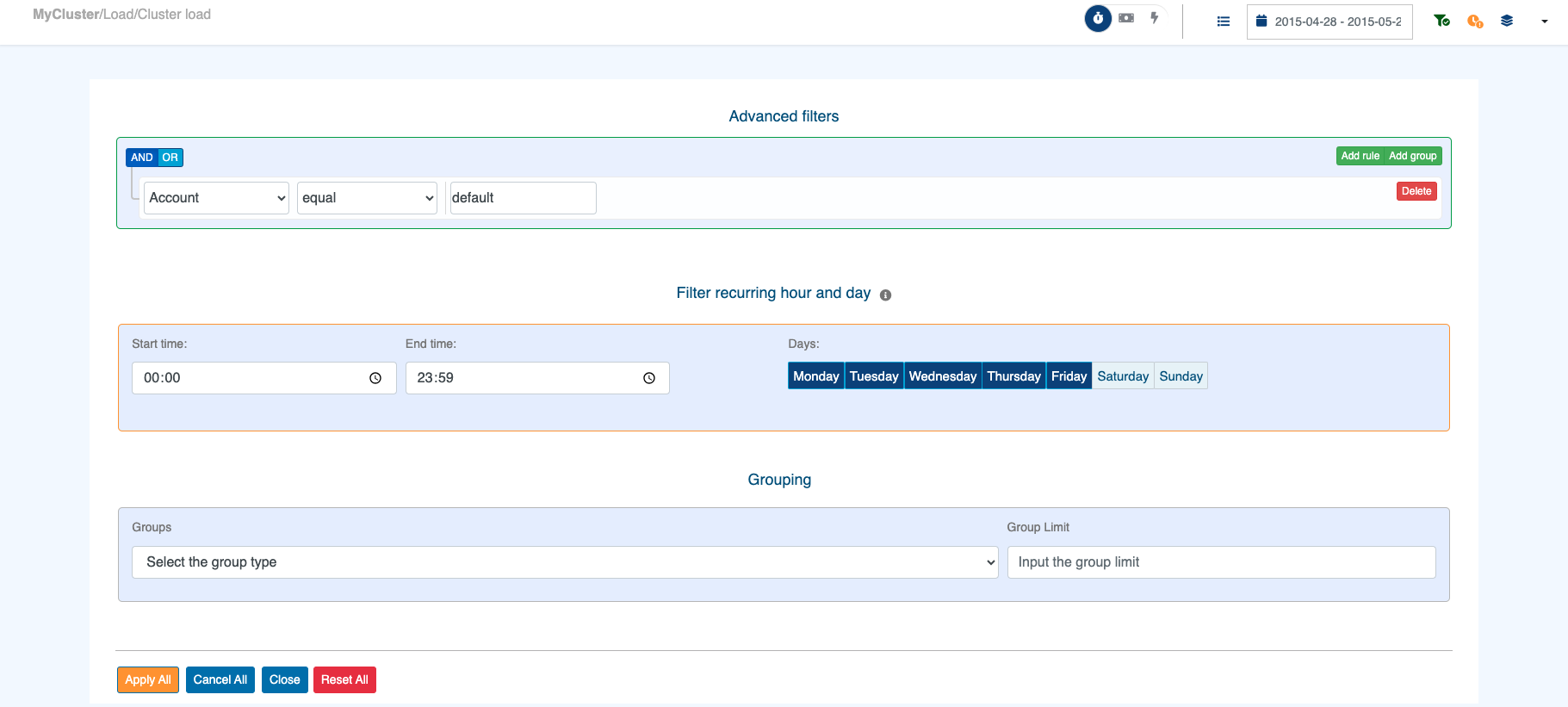 Apply All: Apply all currently configured filters.Cancel All: Discard any unapplied changes to your filters.Close: Close all filters edition windows without losing any modifications you might have made.Reset All: Reset all filters values to theirdefault(e.g. date range: Last 30 days).