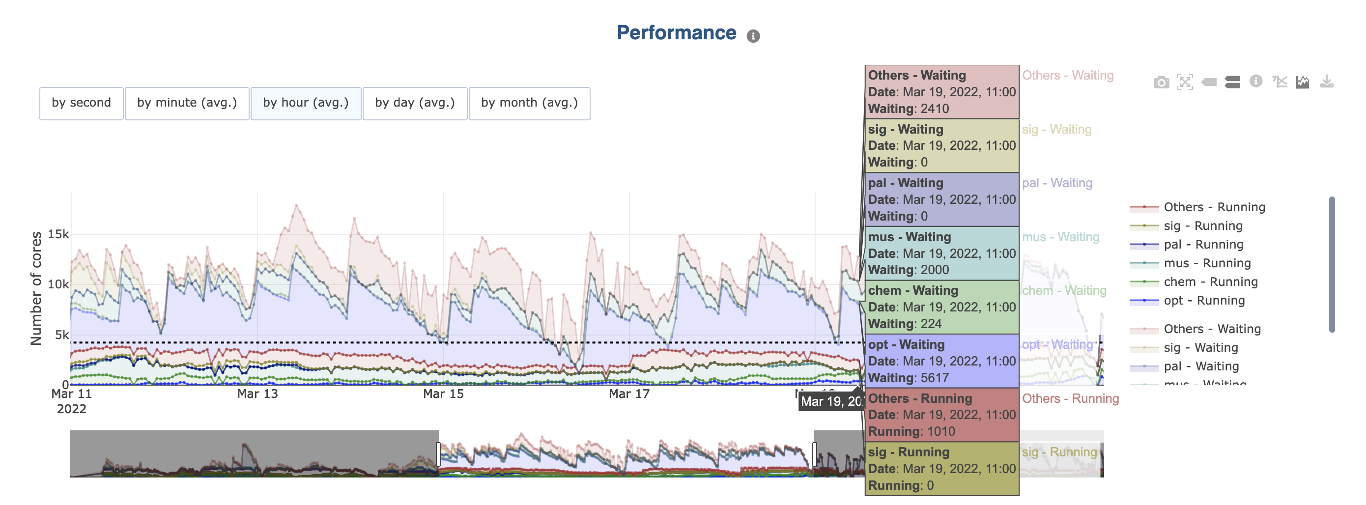Legends are grouped per category (e.g., running and waiting). You can hide/show them all at once by clicking a category element in the legend.