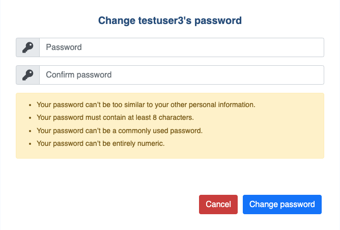 Create new user: Redirect to creation form.Edit icon: Redirect to update form.Delete icon: Delete selected user. If confirmed, deletion cannot be undone.Is active: Designate whether this user should be treated as active.Is superuser: Designate that this user has all permissions without explicitly assigning them.Default cluster: Assign the cluster selected by default when the user logs in.
