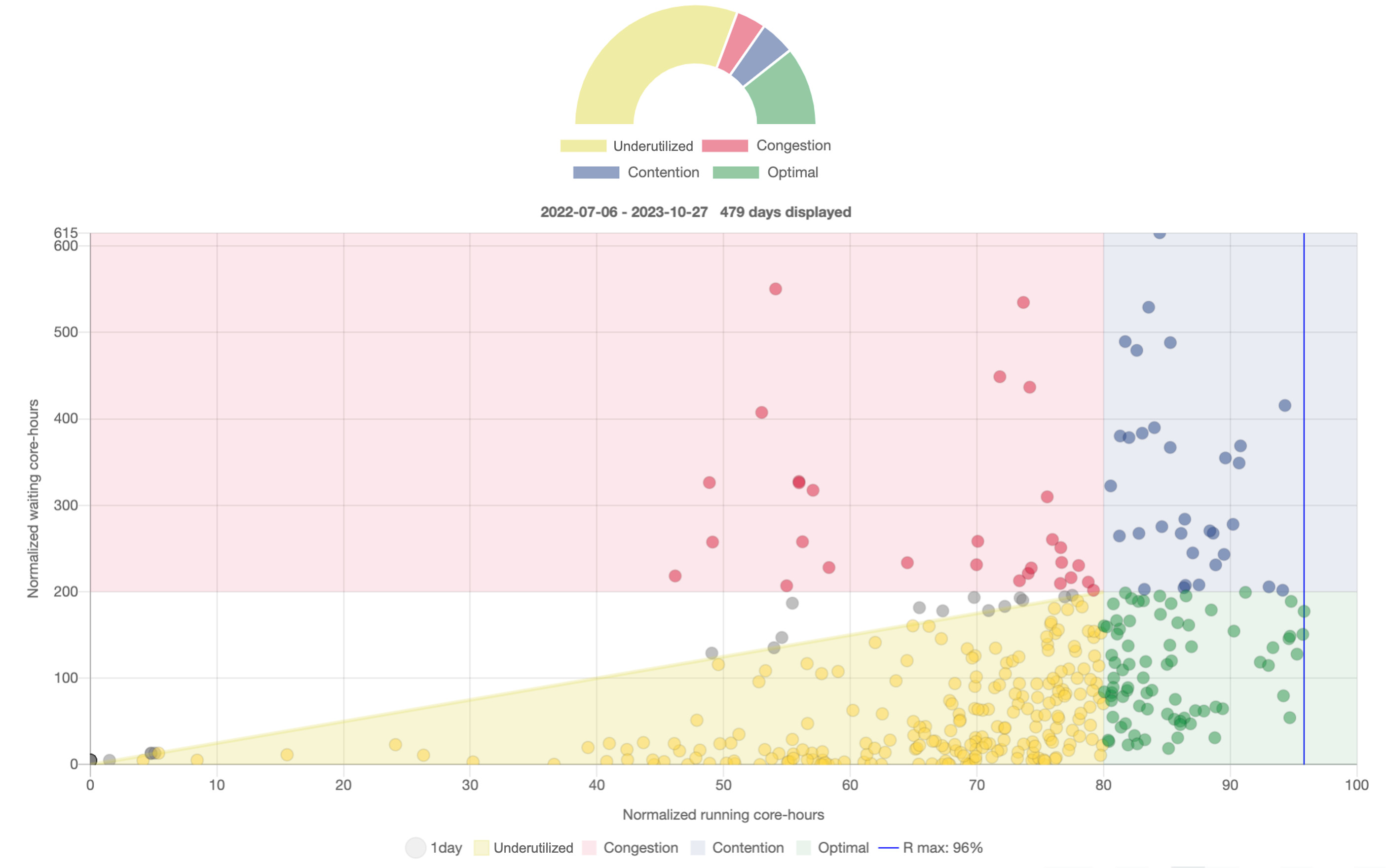 This module shows the cluster state (Optimal, Underutilized, Contention, Congestion) through time, and jobs life cycle.