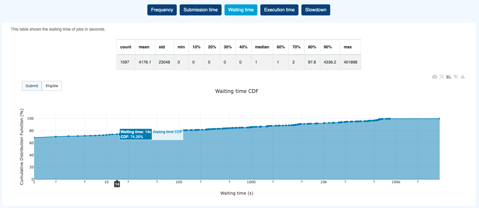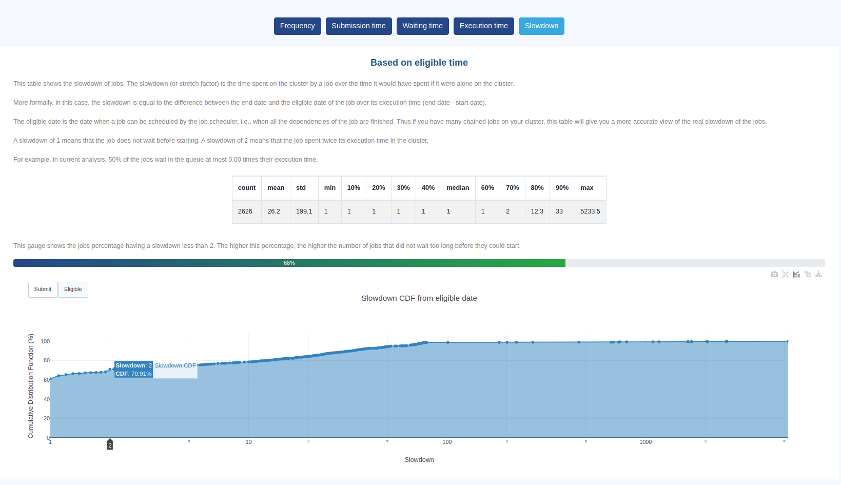 The Cumulative Distribution Function in this example shows that 70.91% of jobs had a slowdown <= 2 meaning that they wait at most as long as their execution time before they could start.