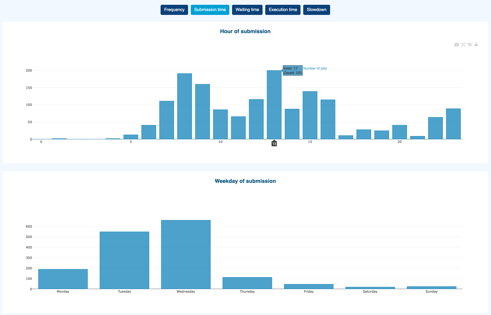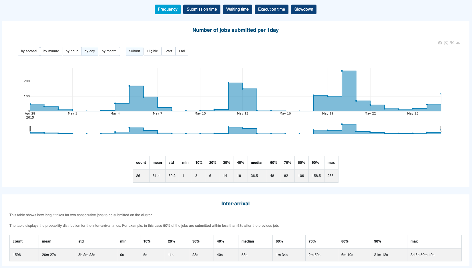 This module analyzes the frequency at which jobs are submitted and enqueued by the job scheduler, as well as their slowdown (time spent by a job on the cluster over its execution time).