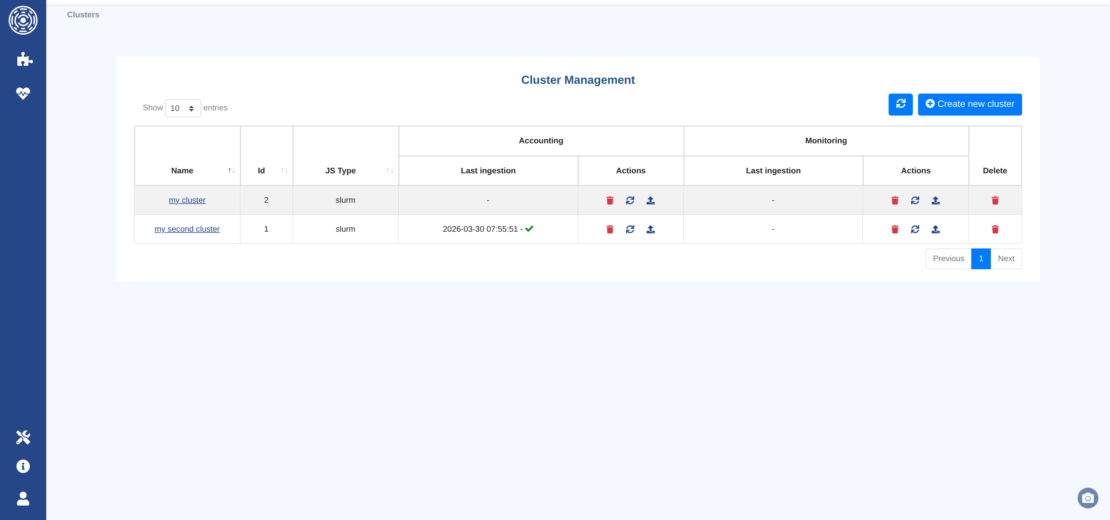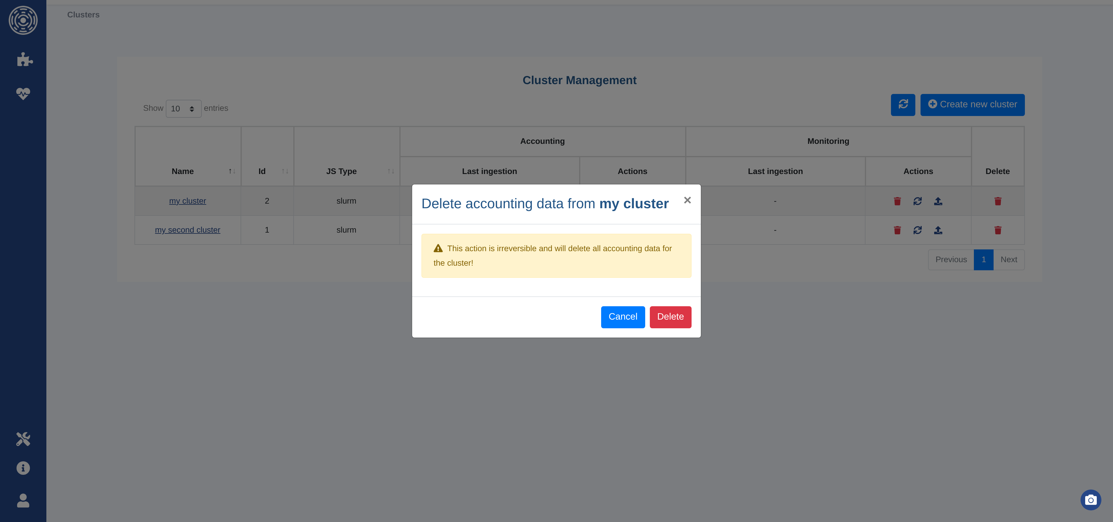 You can delete the data associated with a cluster (accounting or monitoring independently) or permanently remove the entire cluster using the action buttons in the cluster list.