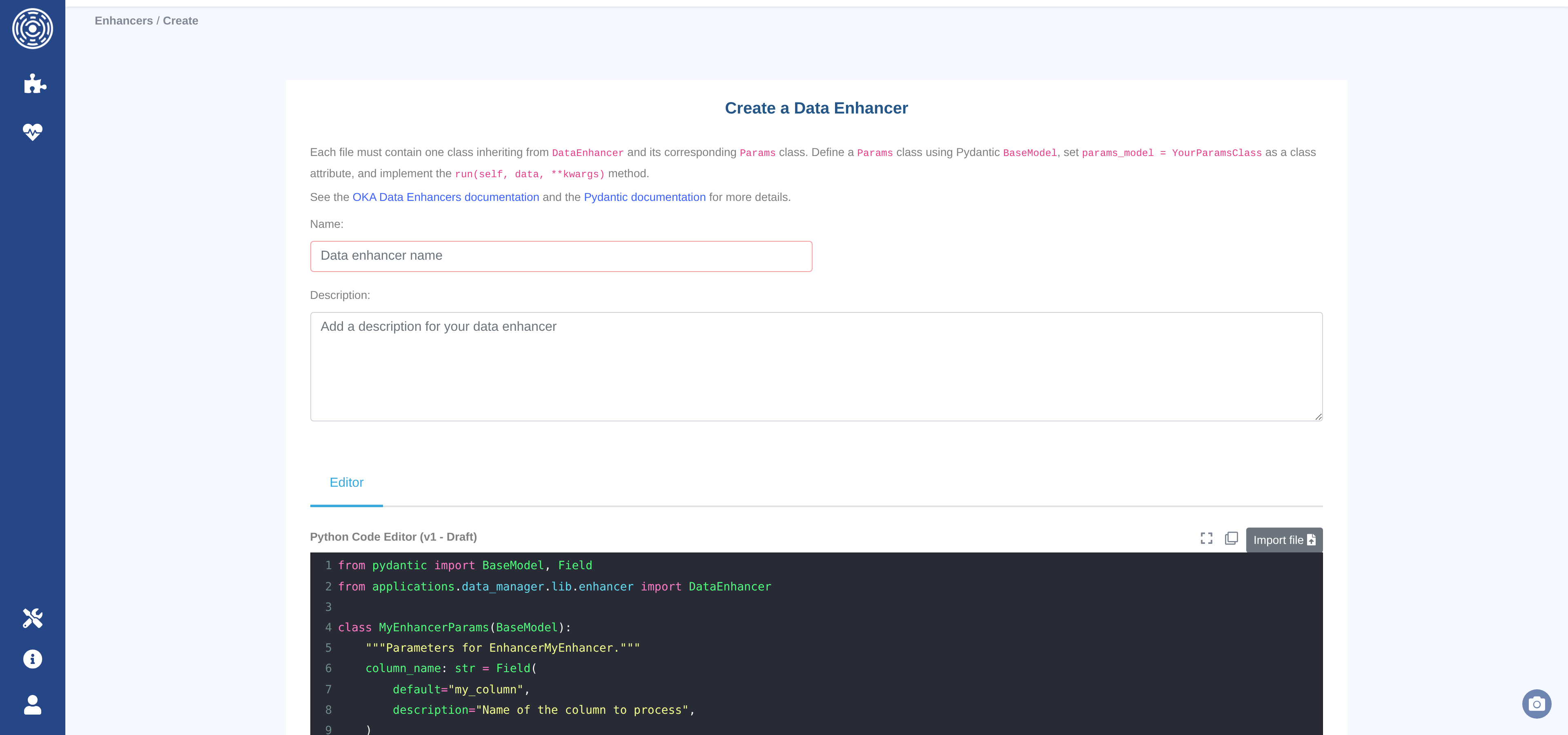 Create a new Data Enhancer — opens the code editor with a boilerplate template.