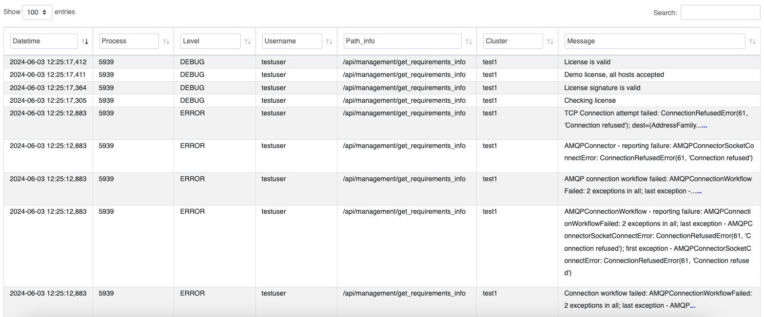 The logs provide detailed information about the system’s operations and any issues encountered. Using the datatable functionalities you can easily filter and navigate through the logs.