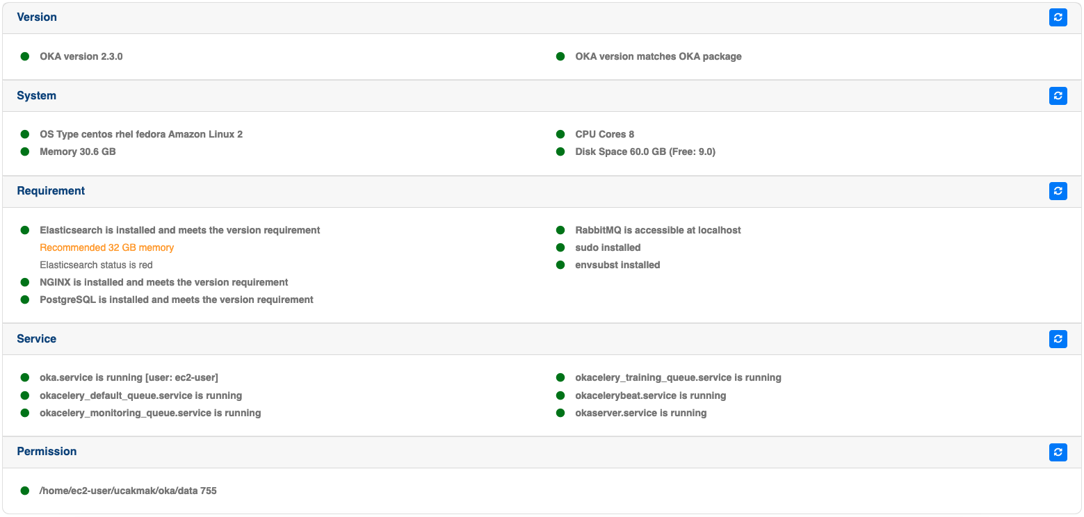 This tab provides various information regarding requirements and service status to ensure OKA is functioning properly without major issues. Green or red dots next to each element indicate whether everything is working as it should. Additional warnings may sometimes be displayed in orange text.