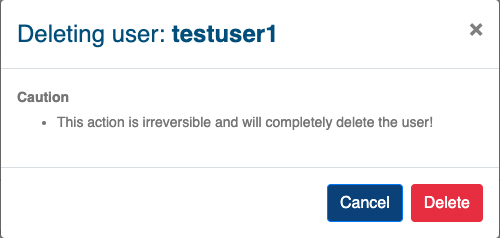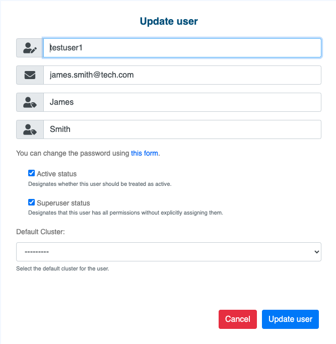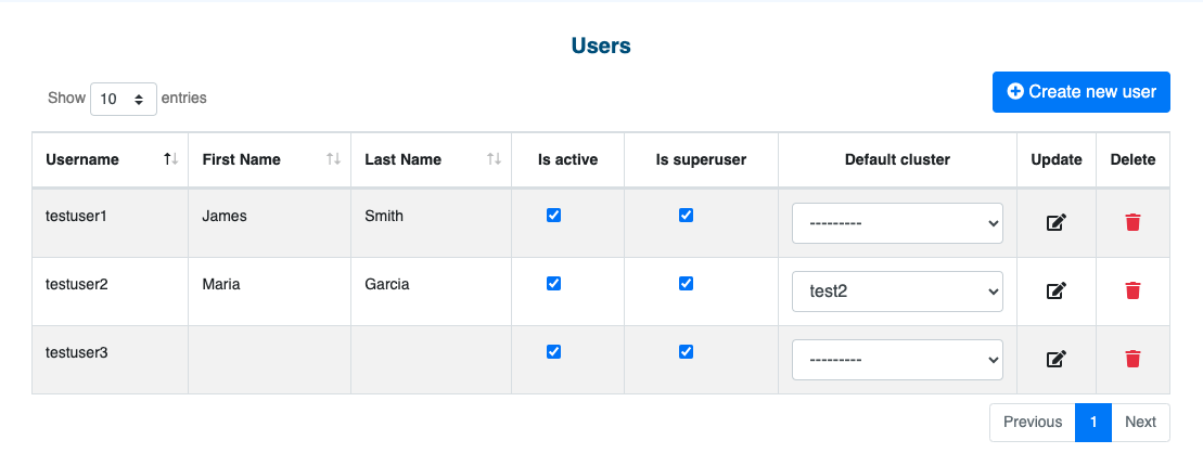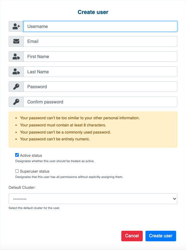 Create new user: Redirect to creation form.Edit icon: Redirect to update form.Delete icon: Delete selected user. If confirmed, deletion cannot be undone.Is active: Designate whether this user should be treated as active.Is superuser: Designate that this user has all permissions without explicitly assigning them.Default cluster: Assign the cluster selected by default when the user logs in.