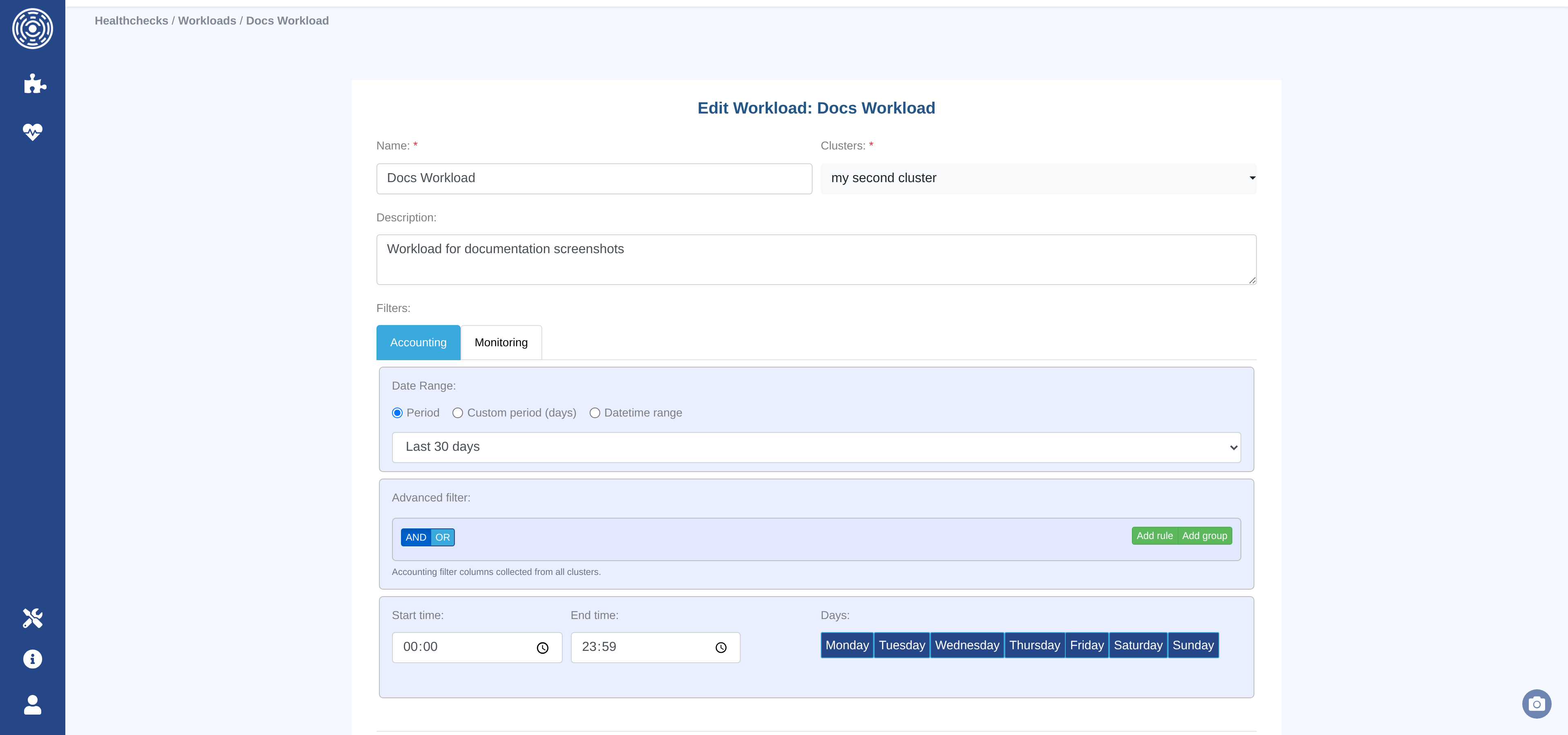 A Workload defines a scoped view of your HPC job data: which clusters to query and what filters to apply when selecting jobs. Features such as Healthcheck use workloads to restrict the data they operate on; other features (e.g., reporting) will use them in the same way.