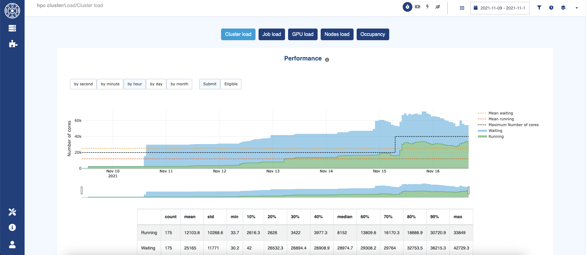 Performance: Running (allocated) and waiting (requested) cores mean values, on a prorated basis for the selected resolution.
