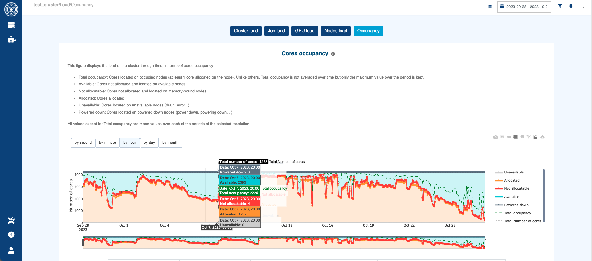 Cores and nodes occupancy. This allows you to spot memory-bound nodes (nodes with unused cores that are not allocatable because all the node memory has been allocated).
