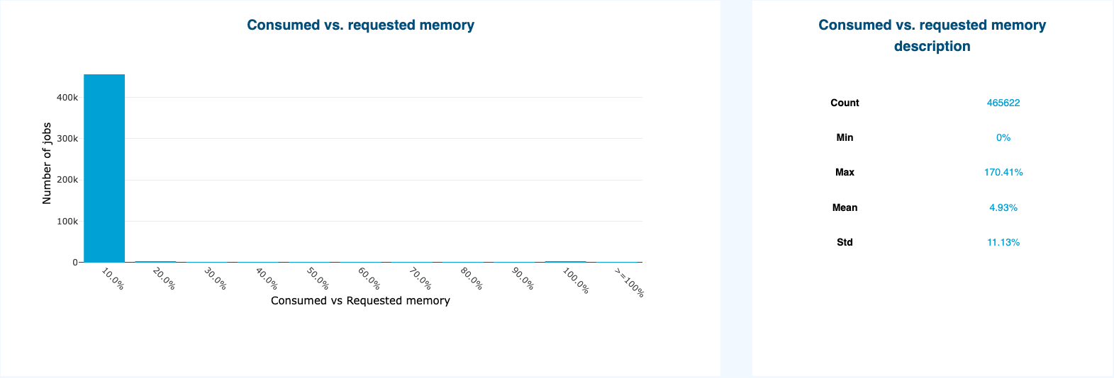 This example shows that most of the jobs consumed less than 10% of the memory they required.