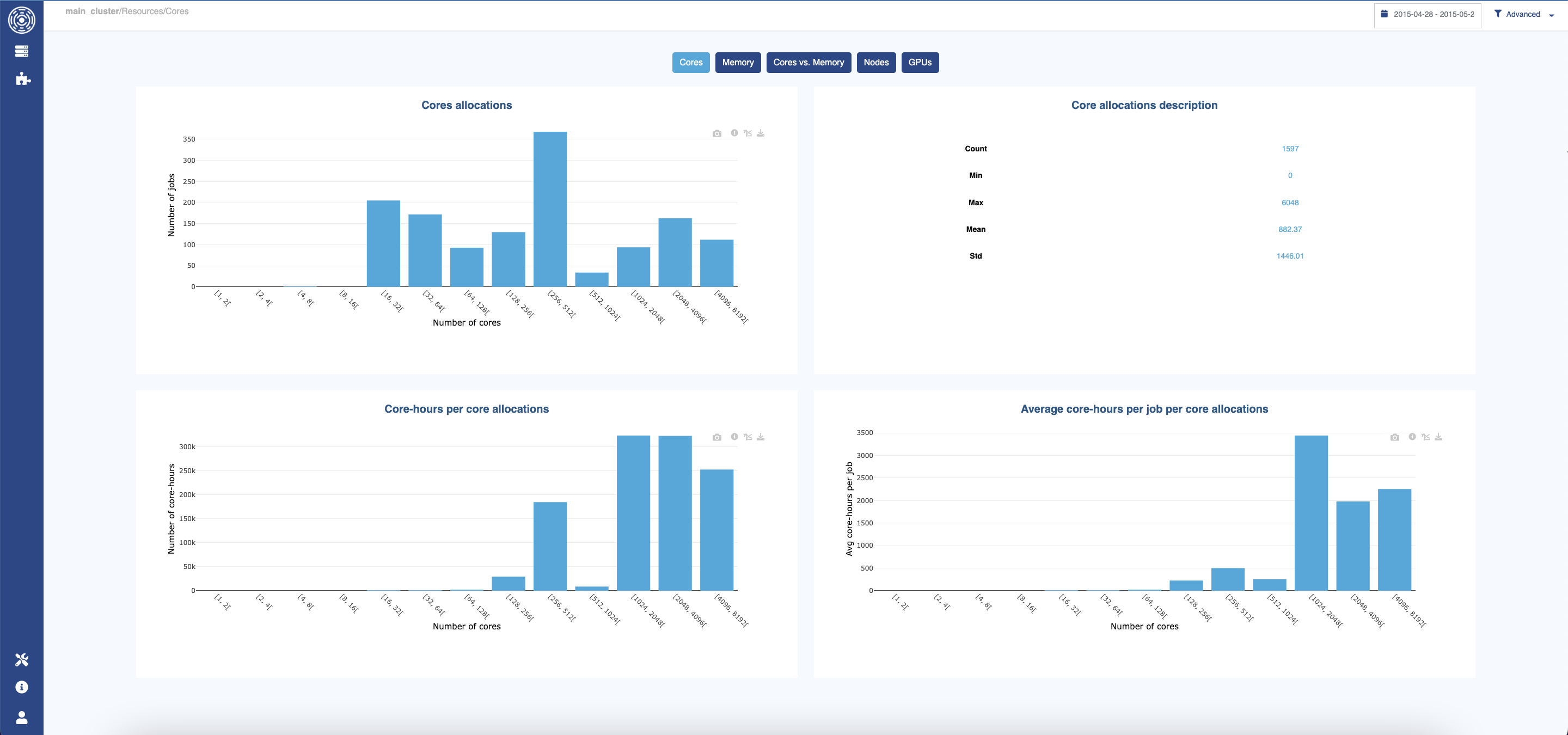 The requested vs. consumed memory scatter plot is particularly useful for spotting over-provisioning: a cluster of points near the bottom of the chart (low consumed / high requested ratio) indicates that jobs are requesting significantly more memory than they actually use. The caption “most jobs consumed less than 10% of the memory they required” in the example above is a typical sign of over-provisioning that can be addressed through user guidance or job policies.