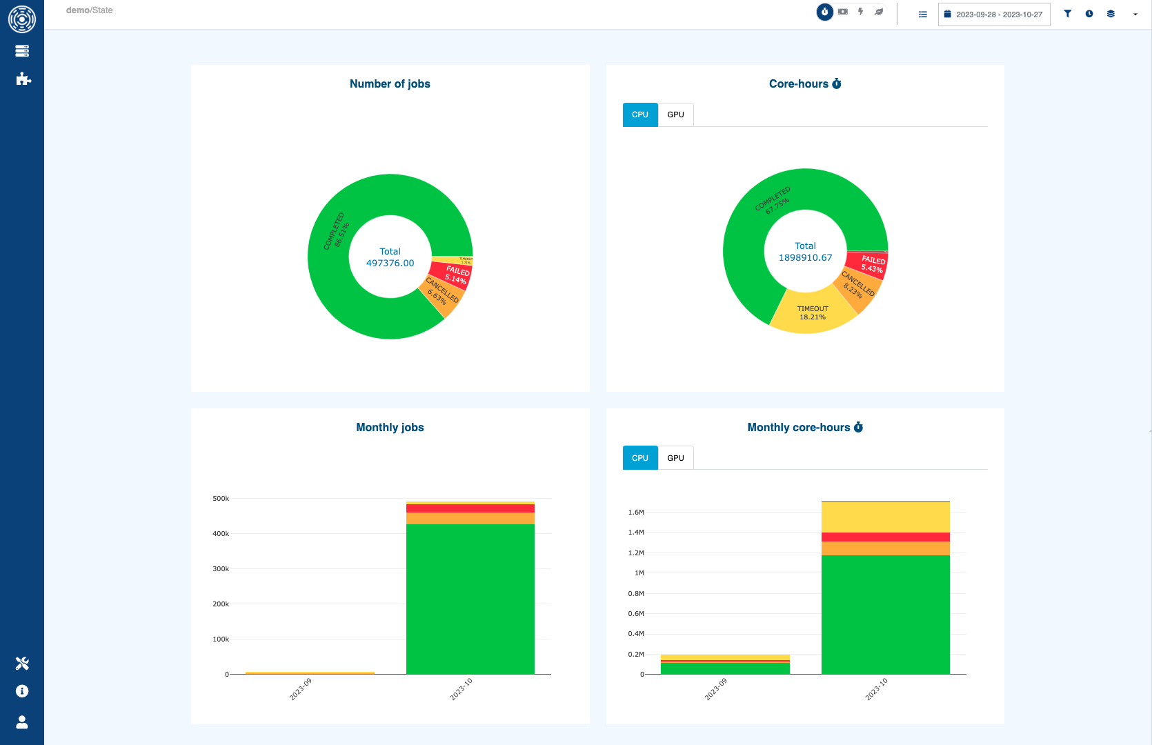 This module displays the distribution of number of jobs and consumed cpu-hours per job state, globally and per month.