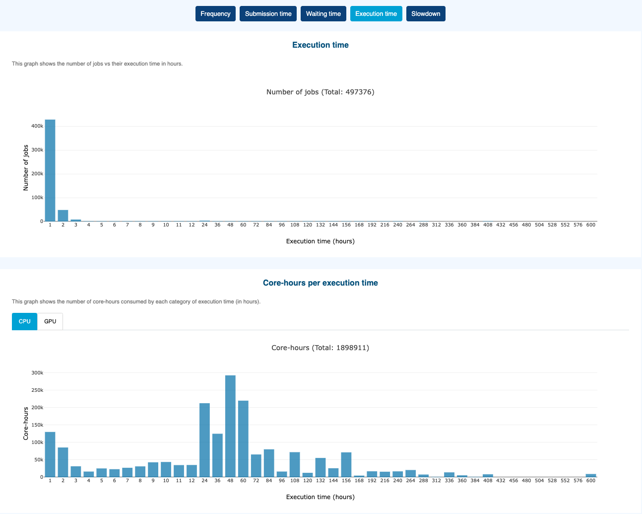 Core-hours or GPU-hours per execution time. Integrated with tabs,