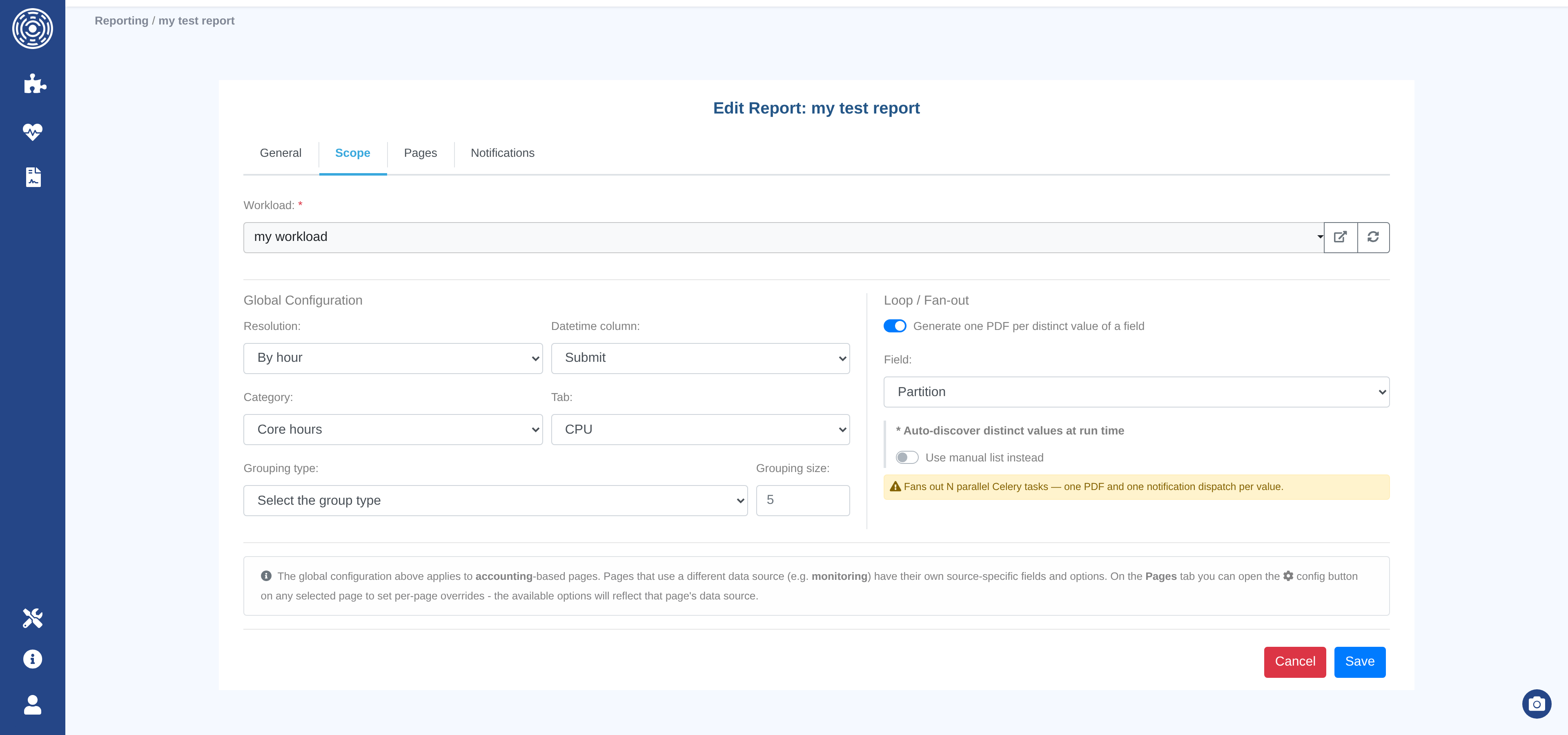 Changing the workload affects all pages in this report immediately. Workloads are shared and mutable — editing a workload impacts every report that references it.